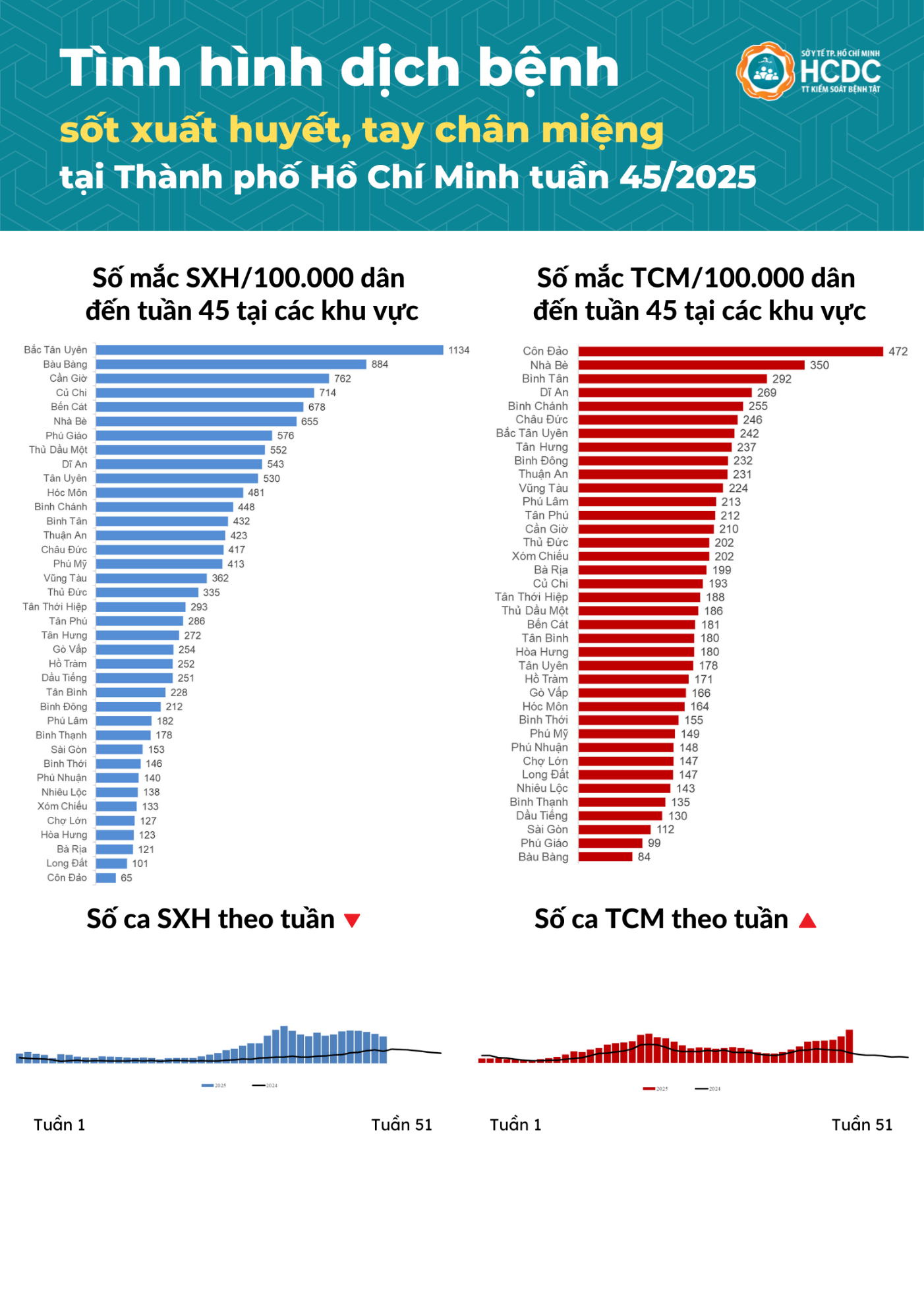 Tại TPHCM, tình hình sốt xuất huyết vẫn diễn biến phức tạp dù ghi nhận xu hướng giảm nhẹ. Trong tuần 45 (từ 3-9/11/2025), toàn thành phố ghi nhận 1.961 ca mắc mới, giảm 14,7% so với trung bình 4 tuần trước. Lũy tích từ đầu năm đến nay, số ca đã lên tới 52.501 trường hợp. Các khu vực có tỷ lệ mắc trên 100.000 dân cao gồm Bắc Tân Uyên, Bàu Bàng và Cần Giờ, cho thấy dịch tập trung nhiều tại các quận/huyện vùng ven và khu công nghiệp.