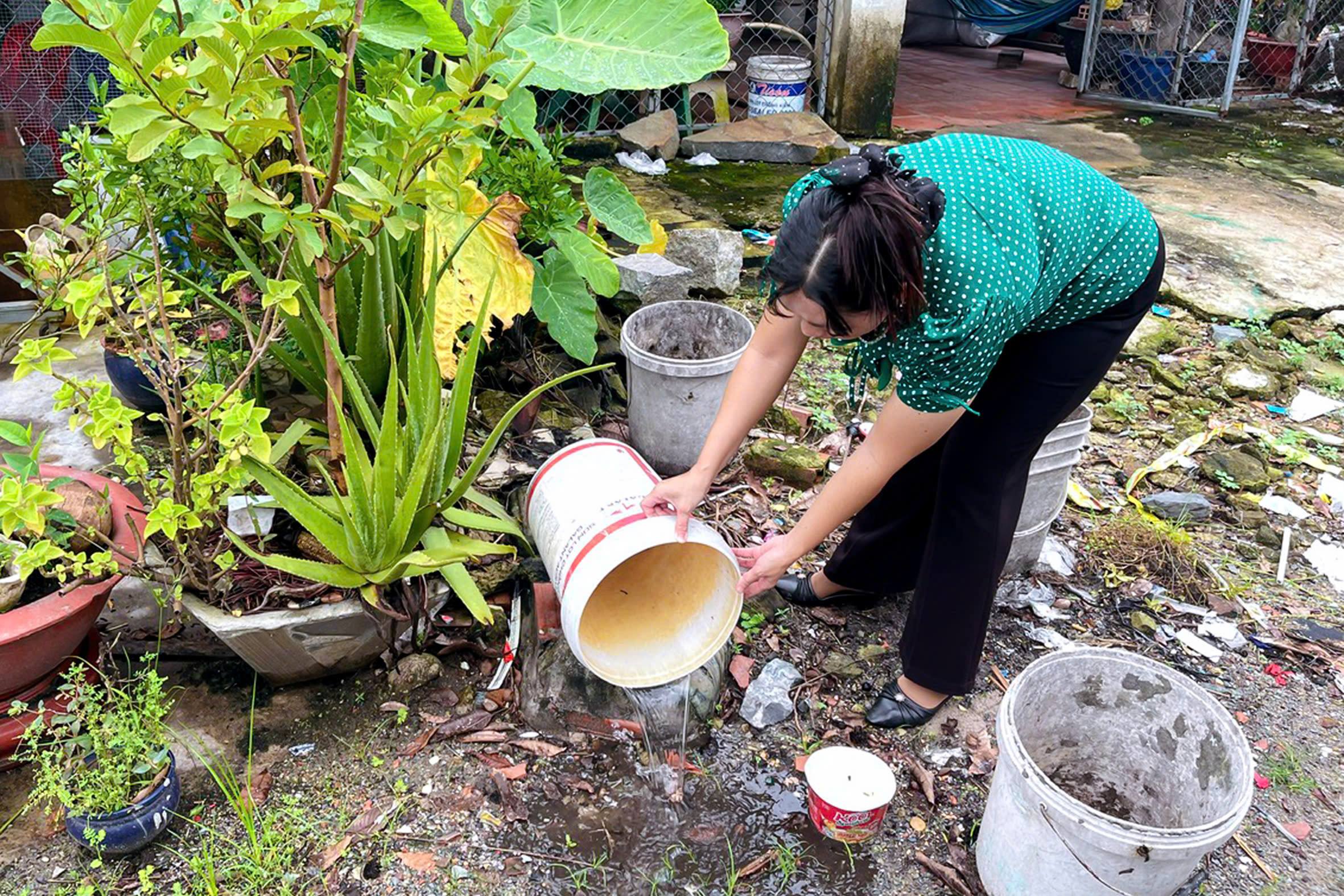 Người dân vệ sinh lu chứa nước, loại bỏ nơi sinh sản của muỗi, diệt lăng quăng (ảnh: SYT Tây Ninh)