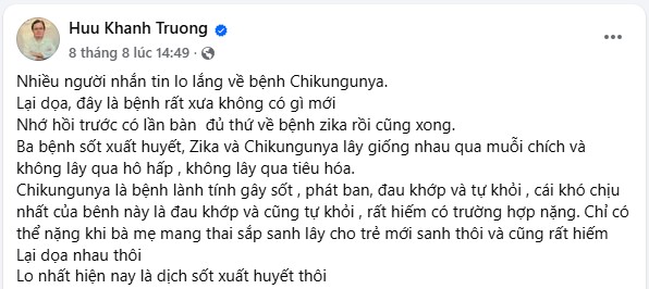 Trong những ngày gần đây, thông tin về bệnh chikungunya xuất hiện dày đặc trên mạng xã hội, khiến nhiều người lo lắng. Tuy nhiên, theo BS Trương Hữu Khanh - chuyên gia bệnh truyền nhiễm, đây là một bệnh “rất xưa”, từng được ghi nhận từ lâu, và thực tế không đáng sợ như nhiều người nghĩ.