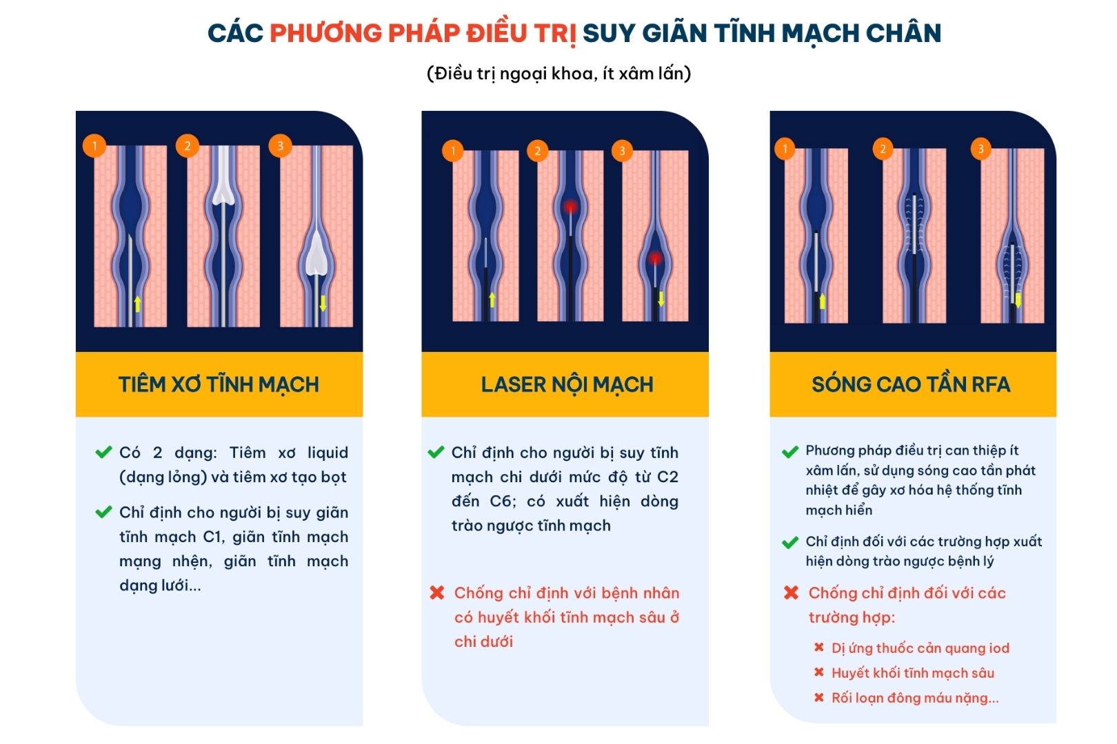 Ở mức độ C1, biện pháp phổ biến là tiêm xơ tĩnh mạch - được các guideline như của Hội Mạch máu châu Âu (ESVS) 2022 khuyến cáo ưu tiên hàng đầu. Laser bề mặt có hiệu quả nhưng thường áp dụng cho giãn mao mạch vùng mặt.