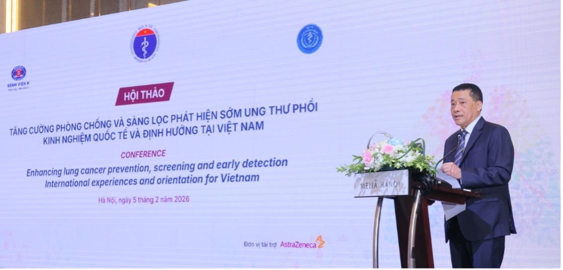 Ngày 5/2/2026, Hội thảo khoa học chuyên đề “Tăng cường công tác phòng chống, sàng lọc phát hiện sớm ung thư phổi: Kinh nghiệm quốc tế và định hướng tại Việt Nam” đã được Bệnh viện K và Cục Phòng bệnh đồng tổ chức với sự tham dự của đại diện Lãnh đạo các Vụ/Cục/Viện thuộc Bộ Y tế: Cục Phòng bệnh, Cục Quản lý Khám, chữa bệnh, Vụ Hợp tác quốc tế, Viện Chiến lược và Chính sách Y tế, các đơn vị chức năng, các bệnh viện, viện nghiên cứu, hội chuyên ngành cùng các chuyên gia trong nước và quốc tế. Hội thảo là diễn đàn trao đổi chuyên môn quan trọng nhằm cập nhật bằng chứng khoa học, chia sẻ kinh nghiệm quốc tế và thảo luận định hướng chính sách trong tăng cường phòng, chống, sàng lọc và phát hiện sớm ung thư phổi tại Việt Nam.