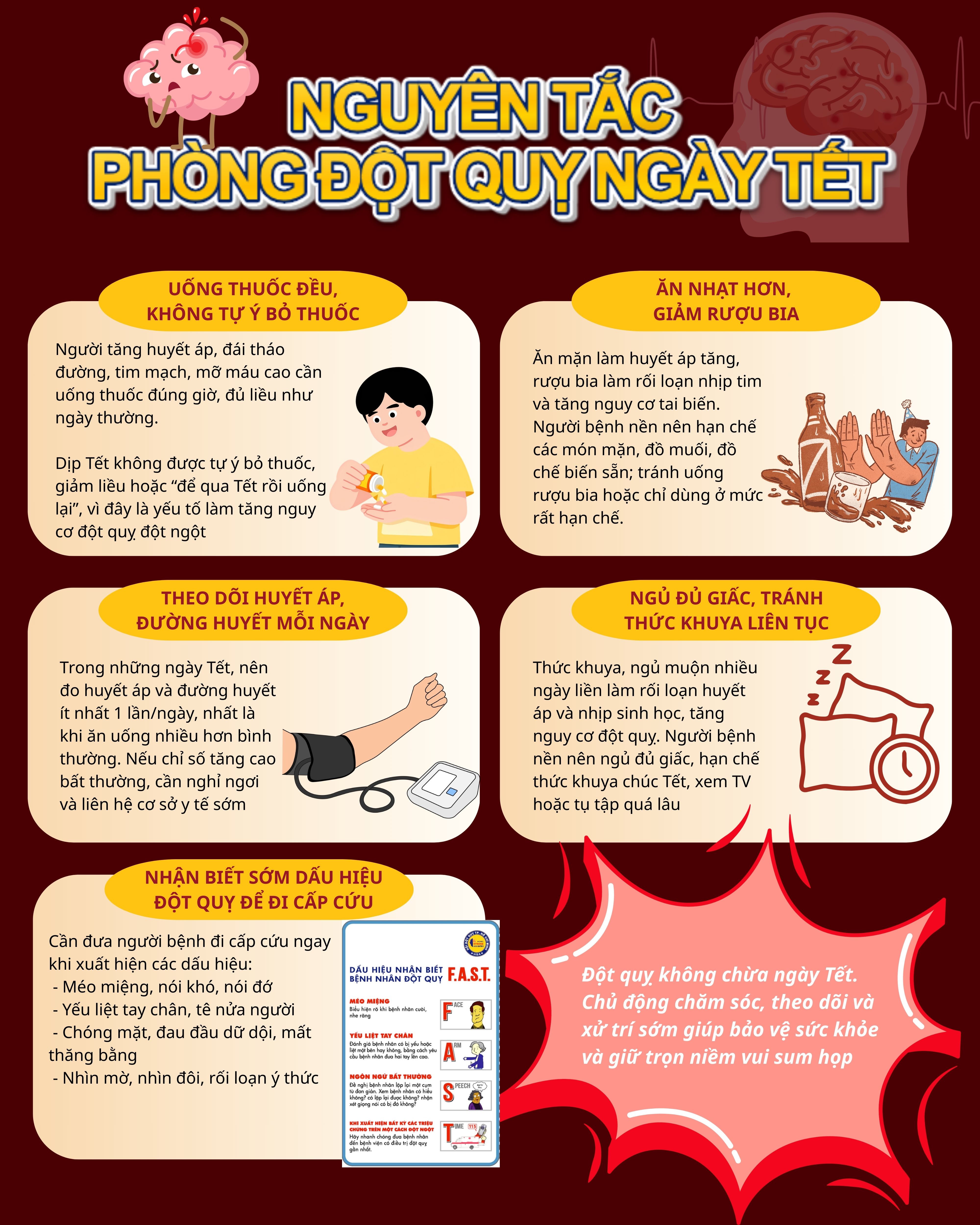 Tết là thời gian sum vầy, nhưng đối với người có bệnh nền, đây cũng là giai đoạn cần đặc biệt chú ý đến sức khỏe để tránh những rủi ro không mong muốn, đặc biệt là đột quỵ. Để đón một cái Tết an vui, trọn vẹn và bảo vệ sức khỏe cho chính mình và người thân, dưới đây là 5 việc làm cần thiết mà người bệnh nền nên thực hiện ngay.