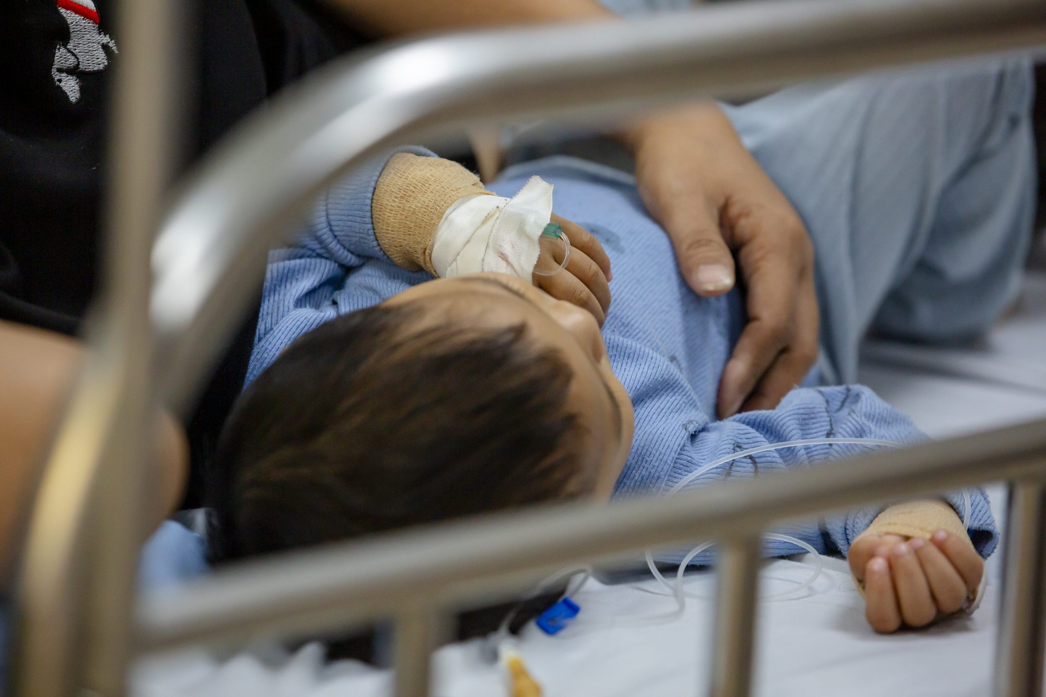 Năm nay, hai mẹ con đón Tết xa nhà. Trên tay Huy vẫn còn những mảng xuất huyết dưới da. Trước đó, chỉ số tiểu cầu của em giảm sâu đến mức nguy hiểm. Nhờ được truyền kịp thời 2 đơn vị tiểu cầu, tình trạng mới dần ổn định.