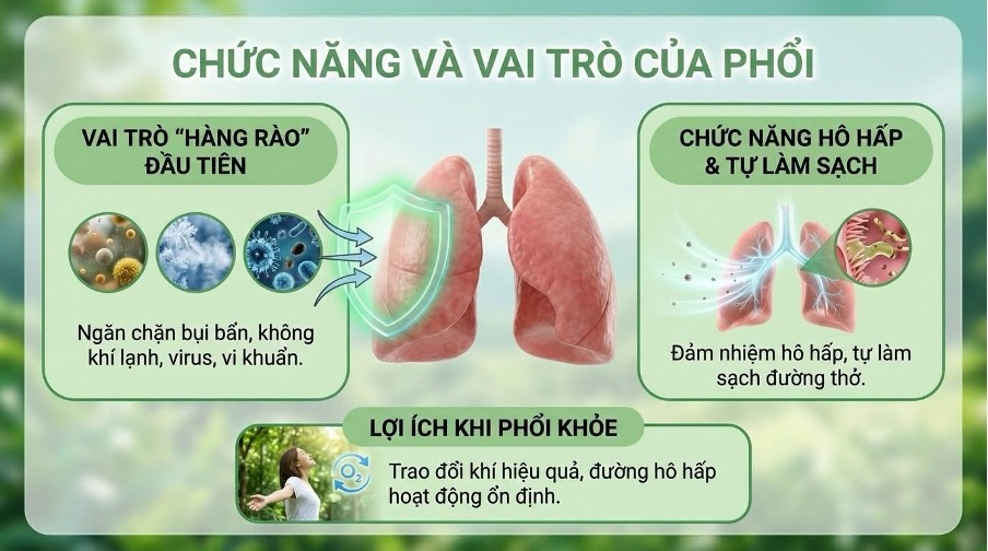 Phổi không chỉ đảm nhiệm chức năng trao đổi khí, mà còn là “lá chắn” đầu tiên của đường hô hấp trước các tác nhân từ môi trường như khói bụi, không khí lạnh, vi khuẩn hay virus. Khi phổi khỏe, khả năng tự làm sạch và thích nghi tốt giúp đường thở ổn định, ít bị kích ứng.