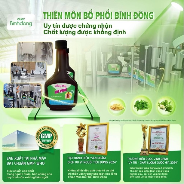 Thiên Môn Bổ Phổi được sản xuất trên dây chuyền đạt chuẩn GMP với quy trình kiểm soát chặt chẽ từ nguyên liệu đầu vào đến thành phẩm. Việc chuẩn hóa quy trình giúp đảm bảo chất lượng đồng nhất, phù hợp với nhu cầu chăm sóc sức khỏe hô hấp lâu dài.