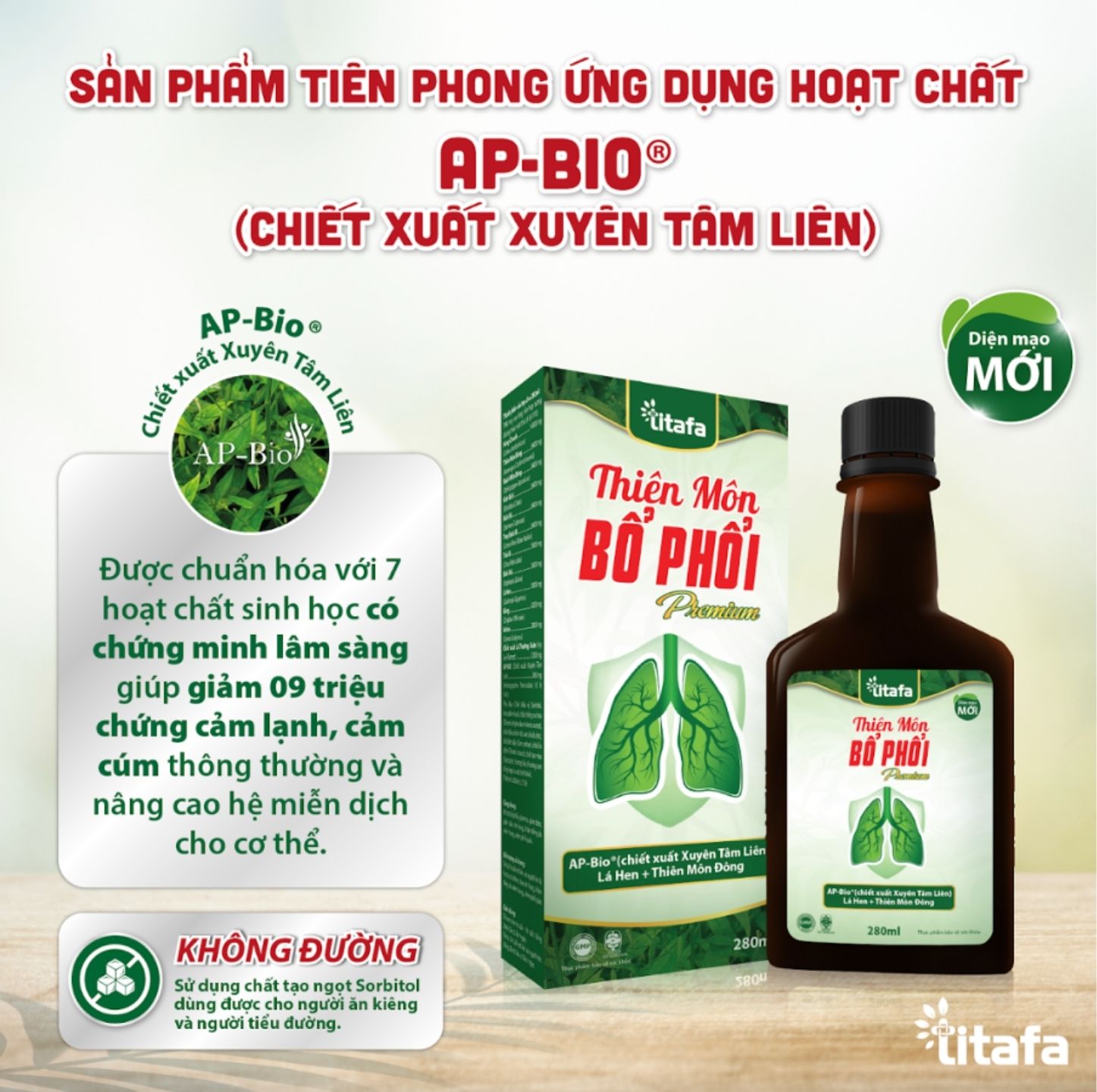 Trong bối cảnh biến đổi khí hậu và ô nhiễm không khí ngày càng gia tăng, việc chăm sóc sức khỏe đường hô hấp đã trở thành mối quan tâm hàng đầu của mọi gia đình Việt. Nhận thức được điều này, Công ty Cổ phần Titafa đã cho ra mắt phiên bản nâng cấp Thiên Môn Bổ Phổi Premium công thức mới với thành phần đột phá AP-Bio® - chiết xuất tiêu chuẩn hóa từ Xuyên Tâm Liên.