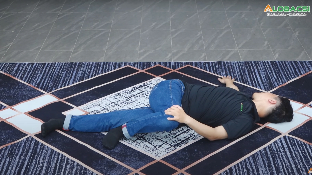 - Bắt chéo chân phải về bên trái, dùng tay kéo đầu gối về sát đất