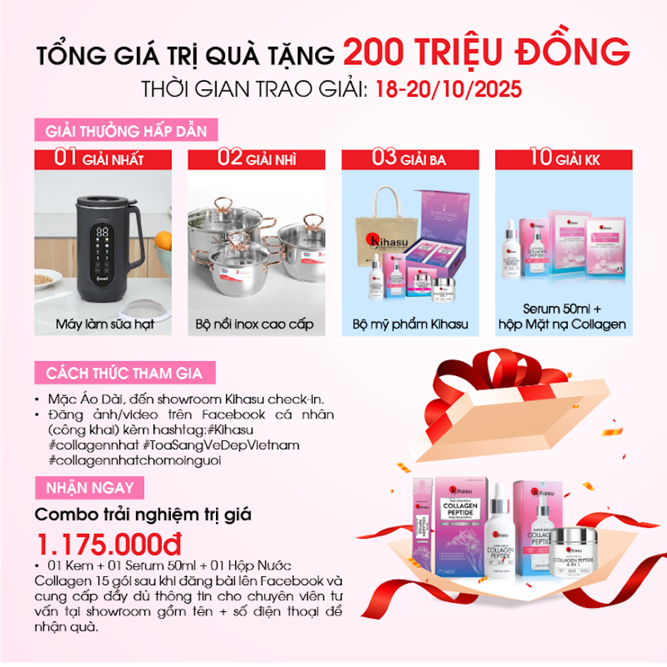 Sau khi hoàn thành đầy đủ 3 bước, bạn sẽ nhận ngay Combo trải nghiệm chăm sóc da trị giá 1.175.000đ, bao gồm: Kem dưỡng Collagen Kihasu, Serum Collagen 50ml và Nước uống Collagen 15 gói. Đây là món quà tri ân, giúp bạn khởi đầu hành trình chăm sóc vẻ đẹp bền vững từ bên trong.
