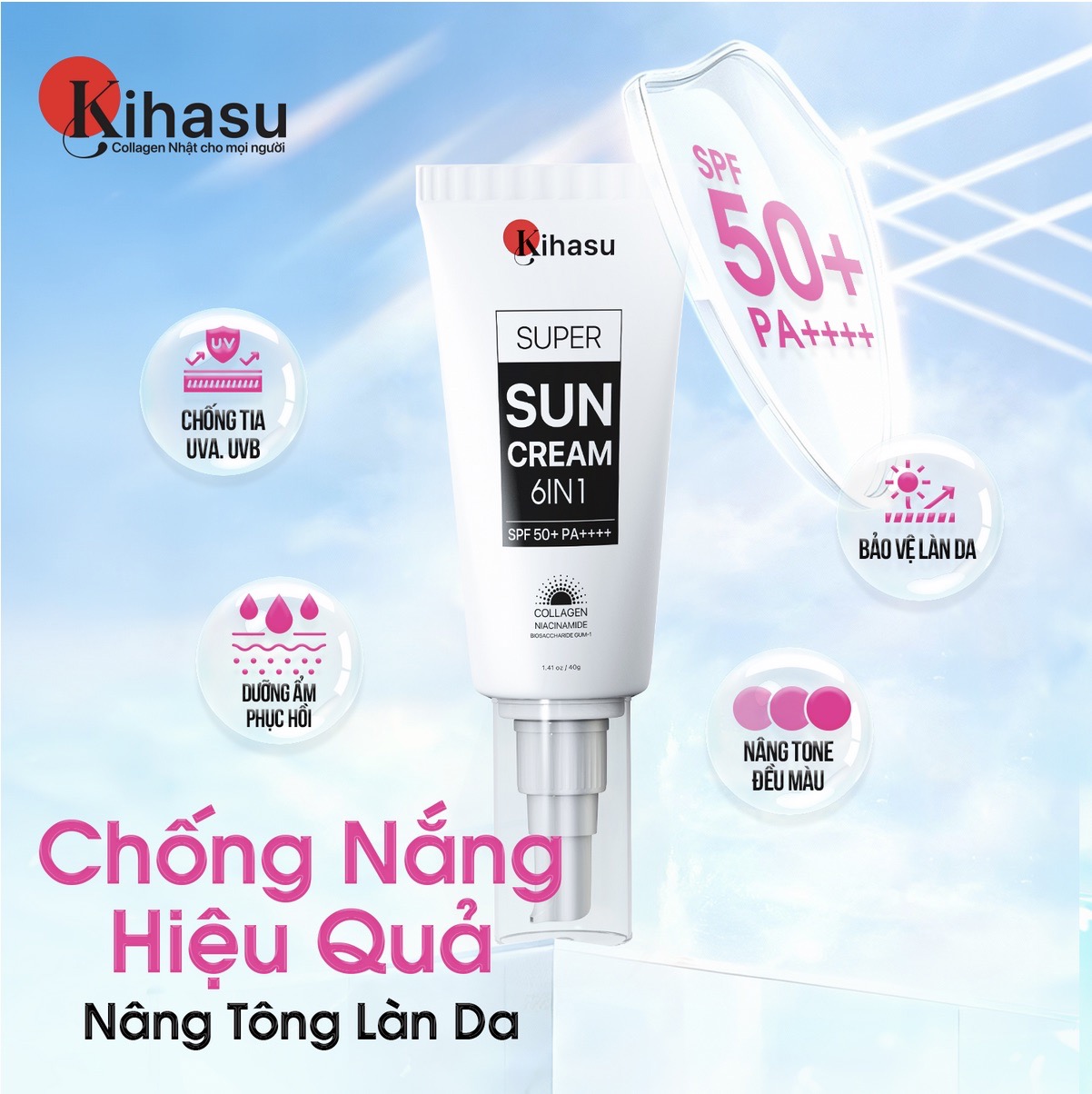 Khi nói đến kem chống nắng, Kihasu Super Sun Cream 6 in 1 SPF 50+ PA++++ nổi bật nhờ khả năng bảo vệ toàn diện trước tác hại của tia UVA và UVB – nguyên nhân chính gây sạm màu, đốm nâu và lão hóa sớm. Sản phẩm kết hợp bộ lọc vật lý Titanium Dioxide và hóa học Ethylhexyl Methoxycinnamate, giúp tạo “lớp khiên” bảo vệ da tối ưu mà vẫn nhẹ nhàng, thấm nhanh, không gây nhờn rít hay vệt trắng.