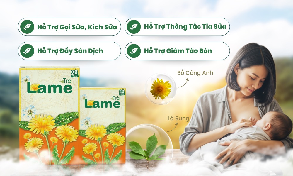 Việc đẩy sản dịch càng nhanh sẽ giúp mẹ sớm ổn định lại sức khỏe hậu sản. Trà lợi sữa Lame với thành phần tự nhiên - lá sung và bồ công anh - có tác dụng hỗ trợ kháng viêm và thanh nhiệt, thúc đẩy cơ thể mẹ đẩy sản dịch ra ngoài hiệu quả hơn, đồng thời có lợi cho quá trình co bóp và hồi phục các bộ phận như âm đạo, cổ tử cung về trạng thái ban đầu. Ngoài ra, các thành phần trong Trà lợi sữa Lame còn có tác dụng hỗ trợ giảm tình trạng táo bón thường gặp ở mẹ sau sinh mà không ảnh hưởng đến chất lượng sữa mẹ.