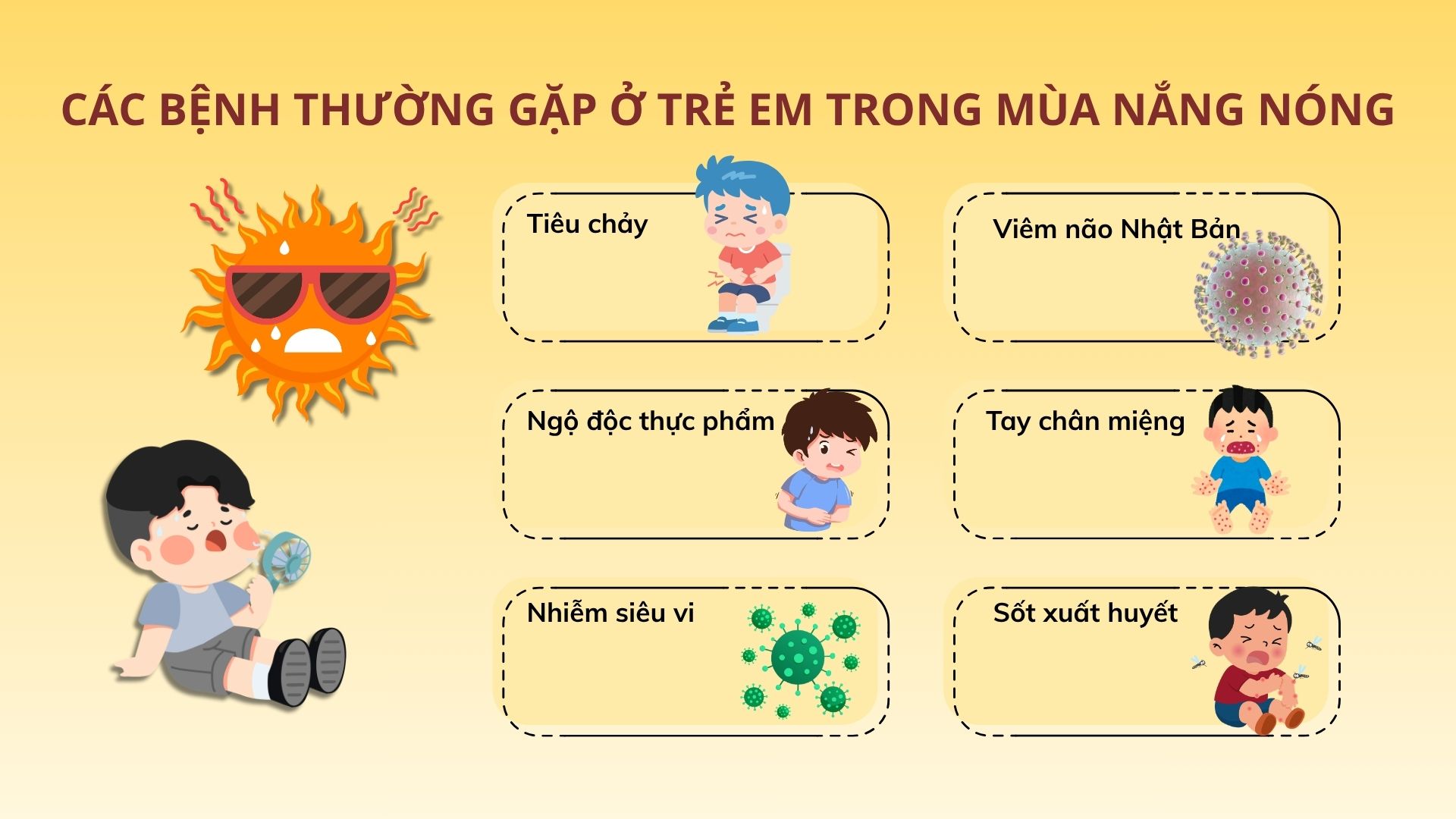 Mùa nắng nóng là thời điểm nhiều bệnh ở trẻ em gia tăng do vi khuẩn, virus phát triển mạnh và sức đề kháng của trẻ còn yếu. Nhận biết sớm và phòng ngừa đúng cách sẽ giúp giảm nguy cơ biến chứng nguy hiểm.