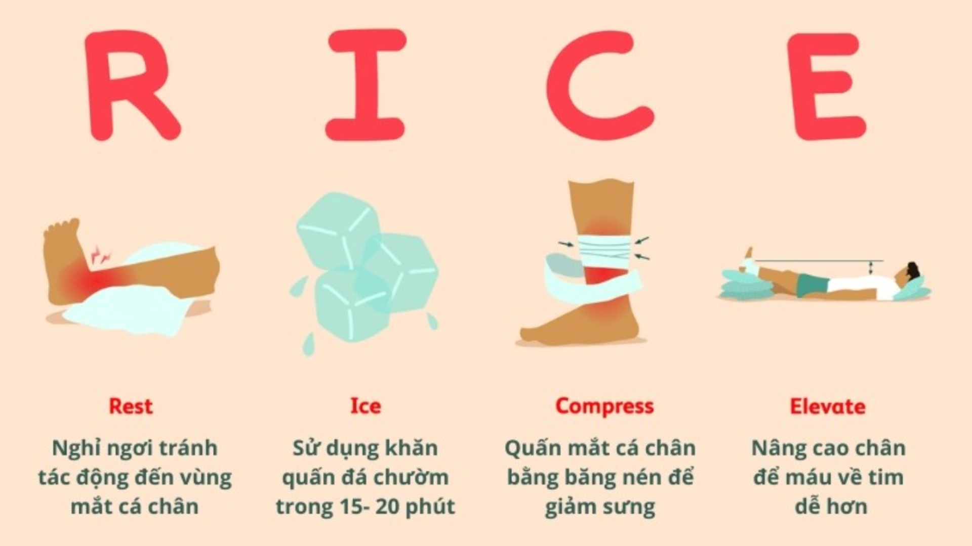 1. Rest - Nghỉ ngơi: Lập tức ngừng di chuyển, tránh tiếp tục dồn lực lên vùng bị đau. Việc cố gắng đi tiếp có thể làm tổn thương dây chằng hoặc cơ nặng hơn.