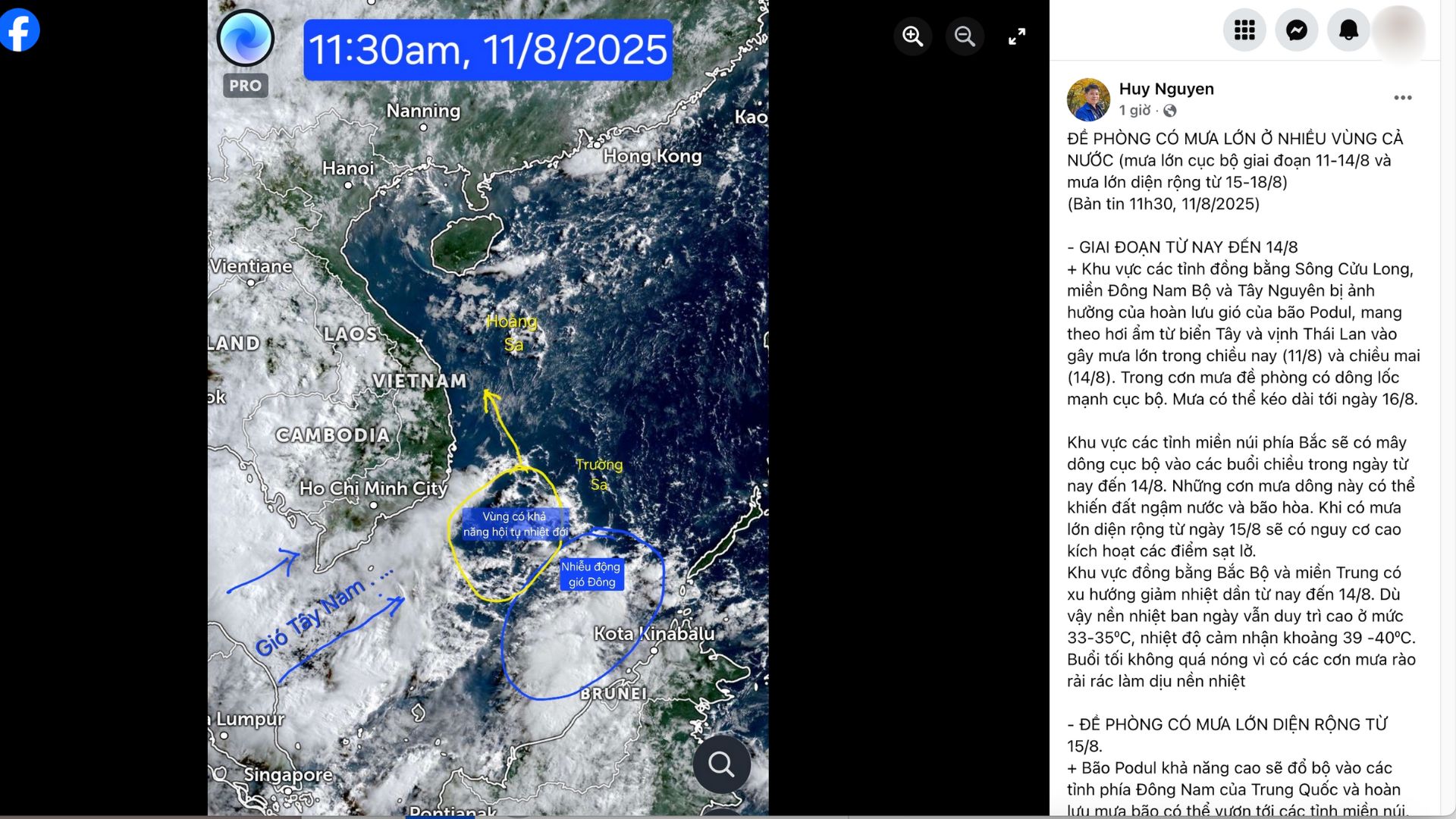 Từ ngày 15/8, hoàn lưu bão Podul có khả năng gây mưa lớn diện rộng tại miền núi, trung du Bắc Bộ và đồng bằng Bắc Bộ, làm gia tăng nguy cơ lũ quét và sạt lở đất. Cùng thời điểm này, một khối nhiễu động gió Đông ở phía Đông quần đảo Trường Sa có thể kết hợp với gió Tây Nam từ vịnh Thái Lan hình thành hội tụ áp thấp. Dù xác suất phát triển thành áp thấp nhiệt đới chưa cao, TS Huy Nguyễn khuyến cáo vẫn cần theo dõi sát.