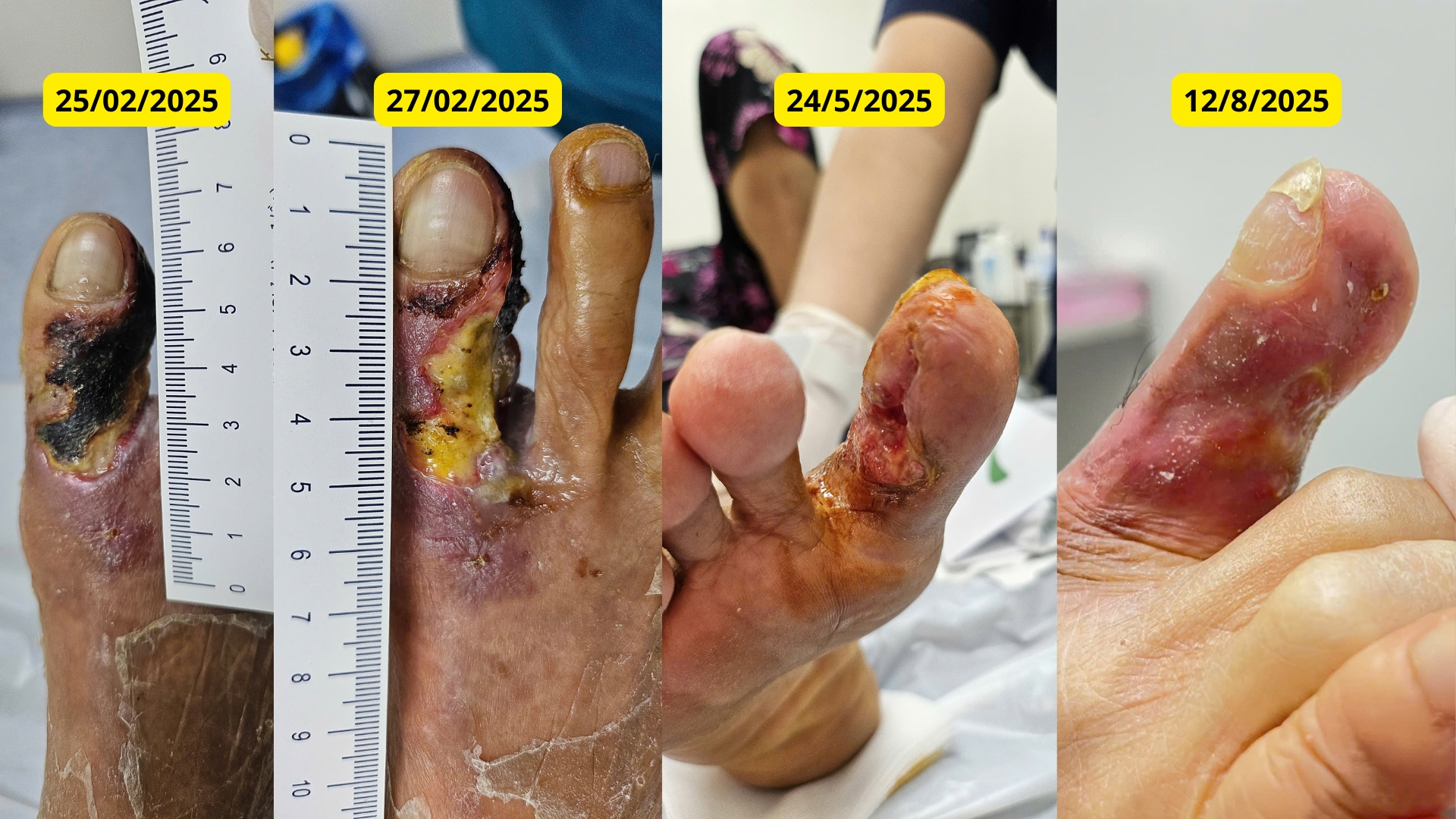Bà Đ.T.T.N. (SN 1964, ngụ Vũng Tàu) đã sống chung với tăng huyết áp và đái tháo đường hơn 10 năm. Tháng 1/2025, trên ngón cái bàn chân phải xuất hiện một vết phồng rộp. Nghĩ chỉ là tổn thương nhỏ, bà thuê người thay băng tại nhà. Thế nhưng, vết thương không những không lành mà ngày càng trầm trọng.