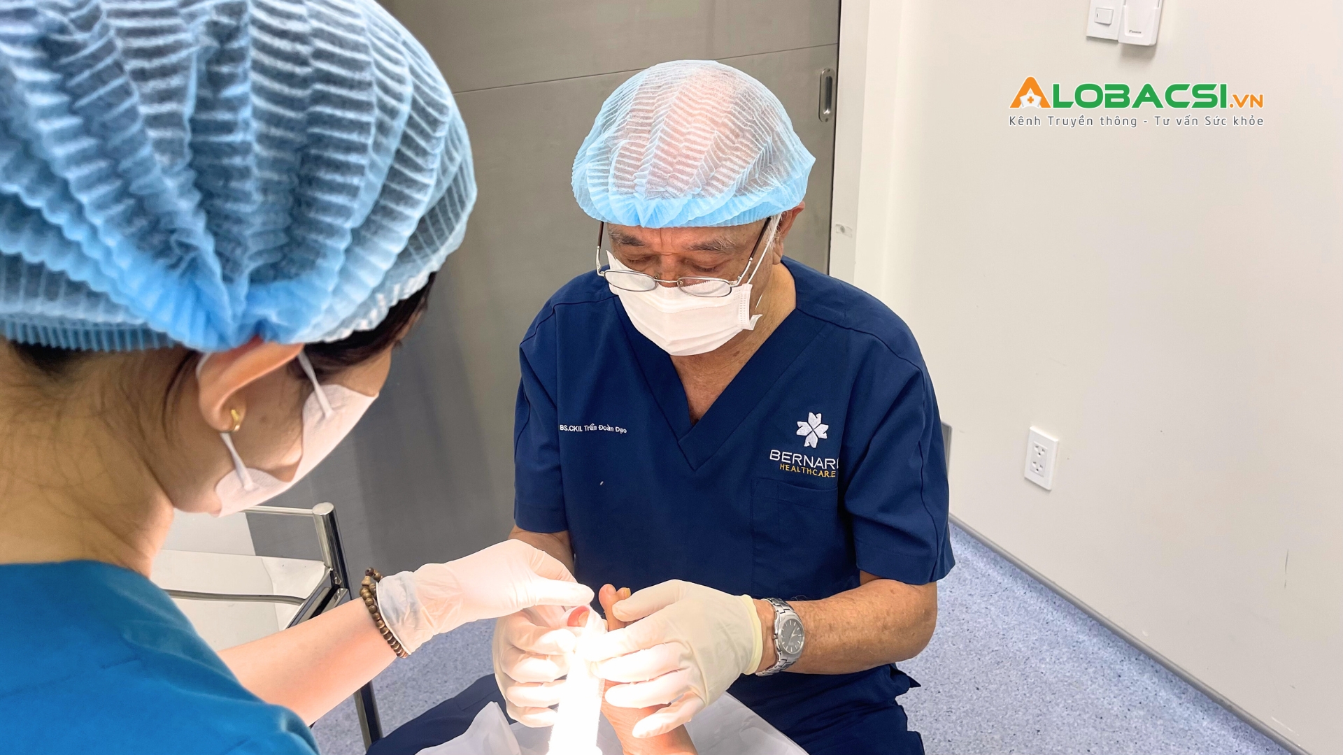 Tại Trung tâm Điều trị vết thương chuyên sâu Bernard, sau khi BS.CK2 Trần Đoàn Đạo trực tiếp thăm khám, ghi nhận ngón chân của bà N. có vết loét hoại tử nửa ngón, tiết dịch mủ vàng, mùi hôi, đau nhức, đi lại hạn chế. Bệnh nhân được chẩn đoán loét bàn chân đái tháo đường, viêm xương.