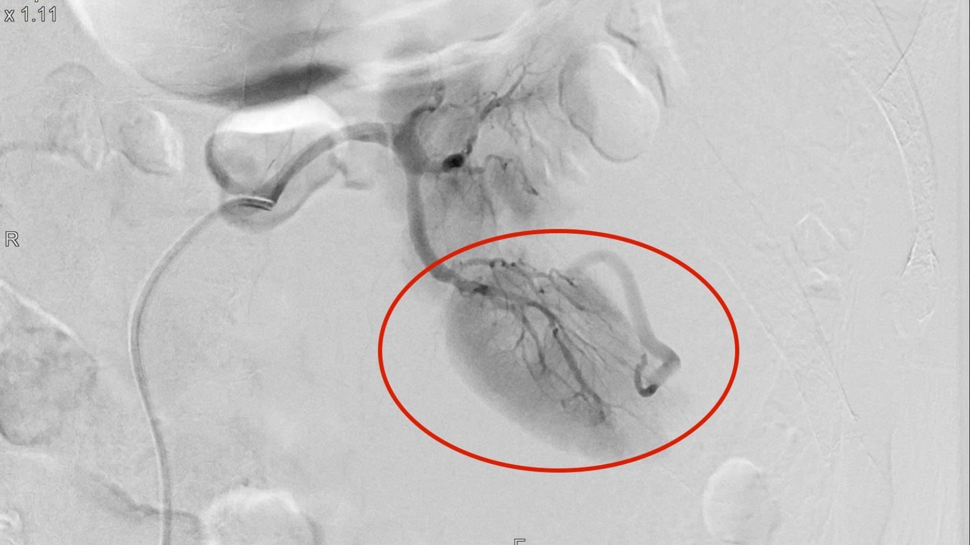 Sau hội chẩn, các bác sĩ xác định bệnh nhân bị vỡ thận trái tự phát mức độ nặng, có ổ chảy máu đang hoạt động. Thay vì mổ hở hoặc cắt bỏ thận - những phương án tiềm ẩn nhiều rủi ro, đặc biệt ở người cao tuổi, ekip quyết định can thiệp mạch cầm máu. Thủ thuật được thực hiện trong khoảng 30 phút, xác định chính xác vị trí thoát mạch tại phân thùy sau thận trái và gây tắc hai nhánh động mạch đang chảy máu. Sau can thiệp, tình trạng đau giảm rõ, huyết động ổn định hơn.