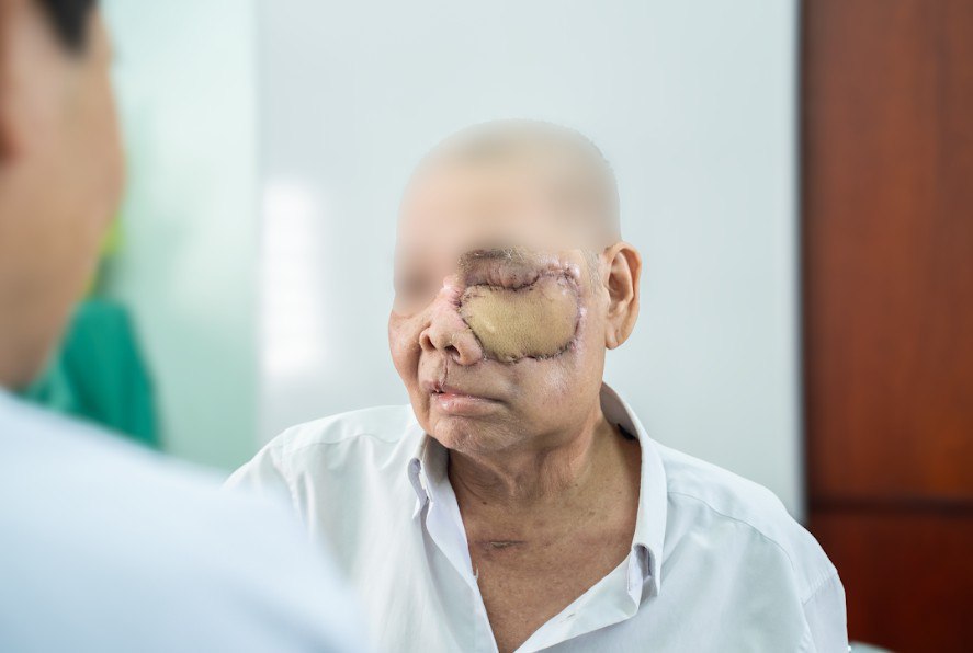 Sau khi cắt bỏ khối u diện rộng, bệnh nhân xuất hiện khuyết hổng lớn vùng mặt. Các bác sĩ khoa Tạo hình – Thẩm mỹ đã thực hiện vi phẫu chuyển vạt tự do từ chân để tái tạo cấu trúc giải phẫu, đồng thời che phủ hốc mắt, tái lập vách ngăn mũi – xoang và tái tạo khẩu cái.