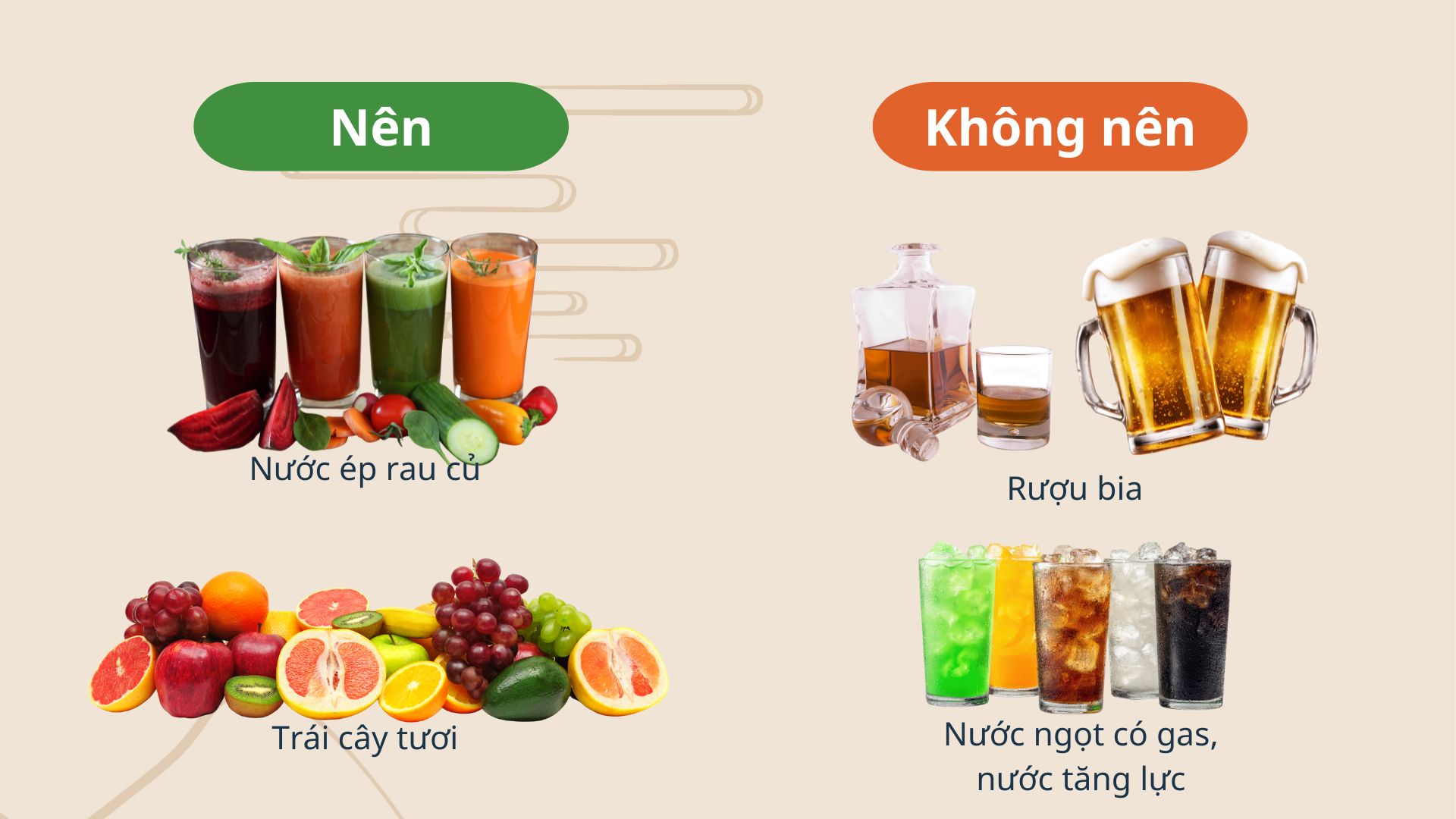 Thay vào đó, các chuyên gia dinh dưỡng khuyến khích ưu tiên nước ép rau xanh và trái cây tươi, không thêm đường. Nước ép cam, bưởi giúp bổ sung vitamin C, tăng đề kháng. Các loại rau như cần tây, cải xoăn, rau diếp cá giàu khoáng chất và chất xơ, hỗ trợ tiêu hóa và giảm cảm giác ngấy sau bữa ăn nhiều đạm, dầu mỡ.