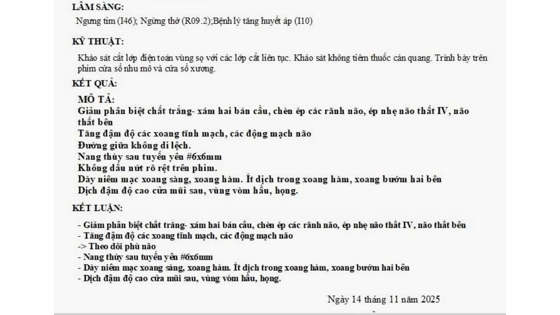 Ekip tiến hành ép tim ngoài lồng ngực, bóp bóng, dùng thuốc, sốc điện. Sau khoảng 15 phút, nhịp tim bệnh nhân có trở lại. Tuy nhiên, kết quả CT não tại bệnh viện cho thấy phù não nặng do thiếu oxy kéo dài. Sau khi được bác sĩ giải thích rõ tình trạng nguy kịch và hướng điều trị tiếp theo, gia đình cân nhắc hoàn cảnh và quyết định xin đưa bệnh nhân về.