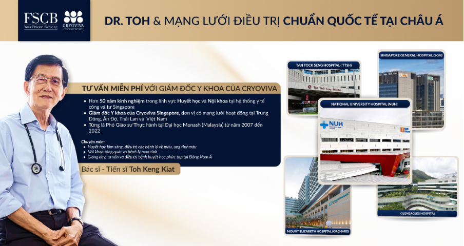 Bên cạnh đó, FSCB-Cryoviva Singapore còn có khả năng kết nối và hỗ trợ y tế tại các bệnh viện hàng đầu Singapore khi cần thiết, mang đến sự an tâm lâu dài cho các gia đình có nhu cầu lưu trữ tế bào gốc theo tiêu chuẩn quốc tế.