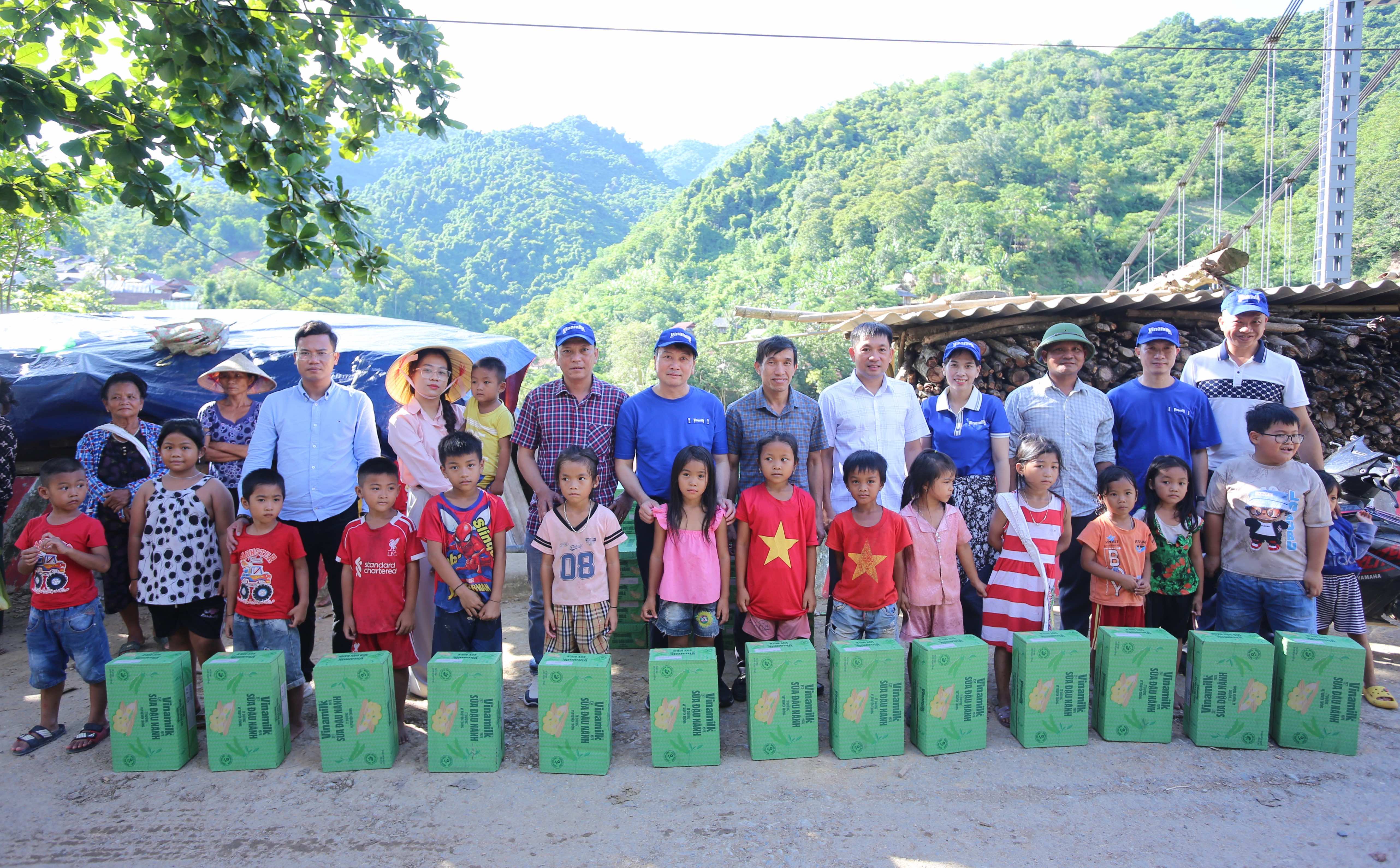 Khép lại hành trình, đoàn công tác đến với xã Nhôn Mai - xã vùng cao còn nhiều khó khăn về giao thông và đời sống. Những thùng sữa và phần quà tiếp tục được trao tận tay người dân và các em học sinh nơi đây.