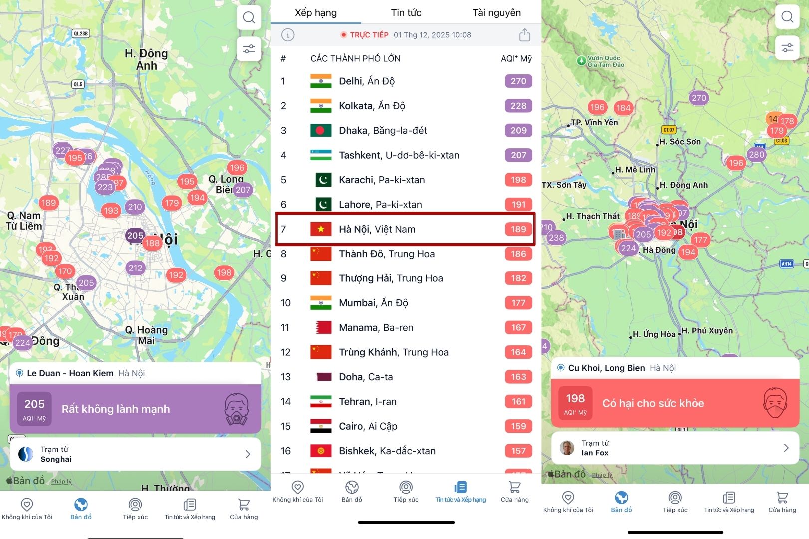 Sáng nay (1/12/2025), chất lượng không khí tại Hà Nội giảm mạnh, nhiều điểm đo chạm ngưỡng màu tím - mức “rất có hại cho sức khỏe”, theo khuyến cáo của Tổ chức Y tế Thế giới (WHO). Đây là mức ô nhiễm có thể gây ảnh hưởng đến tất cả mọi người, đặc biệt nguy hiểm với trẻ nhỏ, người cao tuổi, phụ nữ mang thai và người mắc bệnh nền.